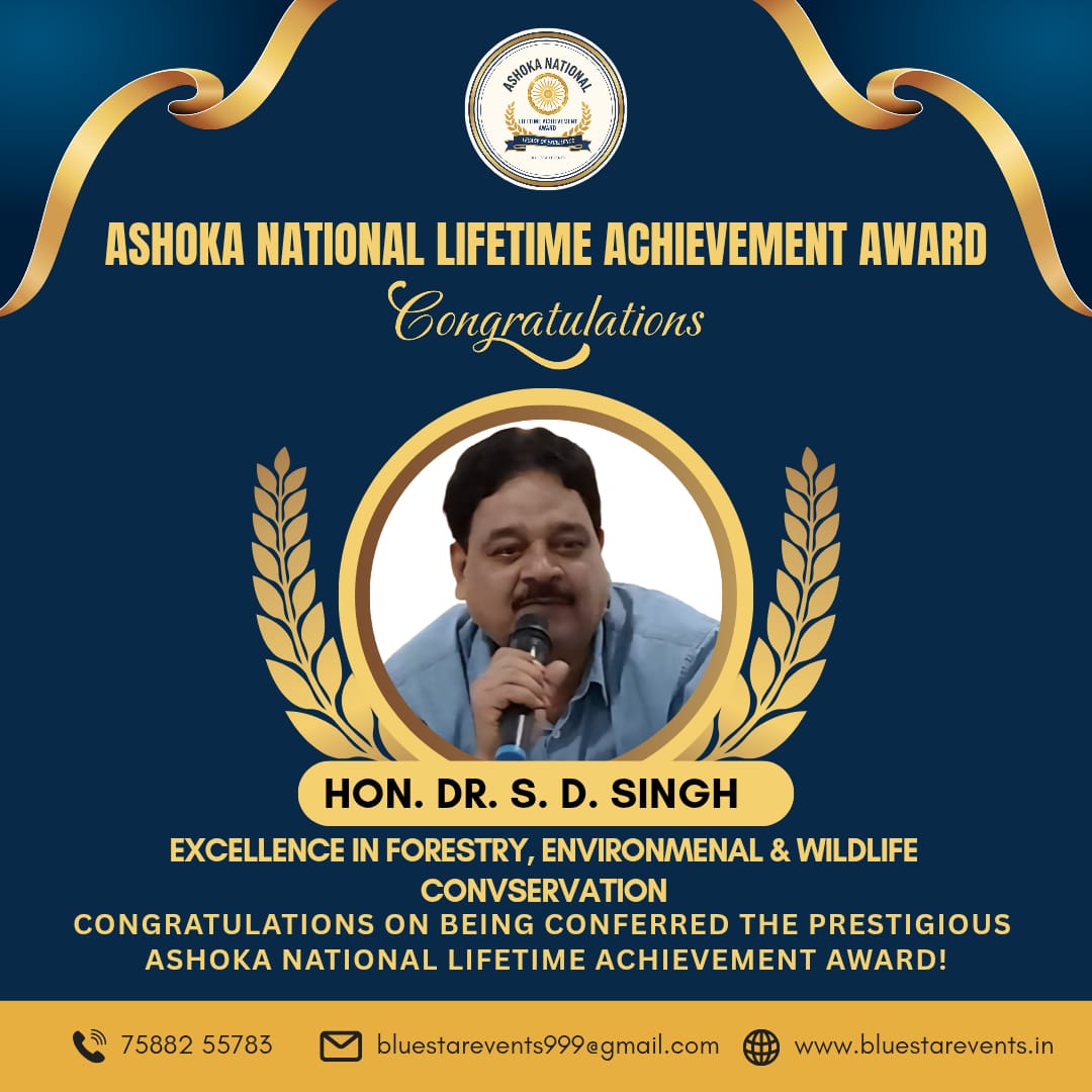 रांची, झारखंड – 20 अक्टूबर, 2025 – माननीय डॉ. एस. डी. सिंग, देवघर वन प्रभाग, झारखंड के वन क्षेत्र अधिकारी, को उनके जीवनपर्यंत संरक्षण में असाधारण योगदान के लिए प्रतिष्ठित अशोका नेशनल लाइफटाइम अचीवमेंट अवार्ड से सम्मानित किया गया है। यह सम्मान विशेष रूप से वन, पर्यावरण और वन्यजीव संरक्षण में उत्कृष्टता के क्षेत्र में उनके योगदान को मान्यता देता है।