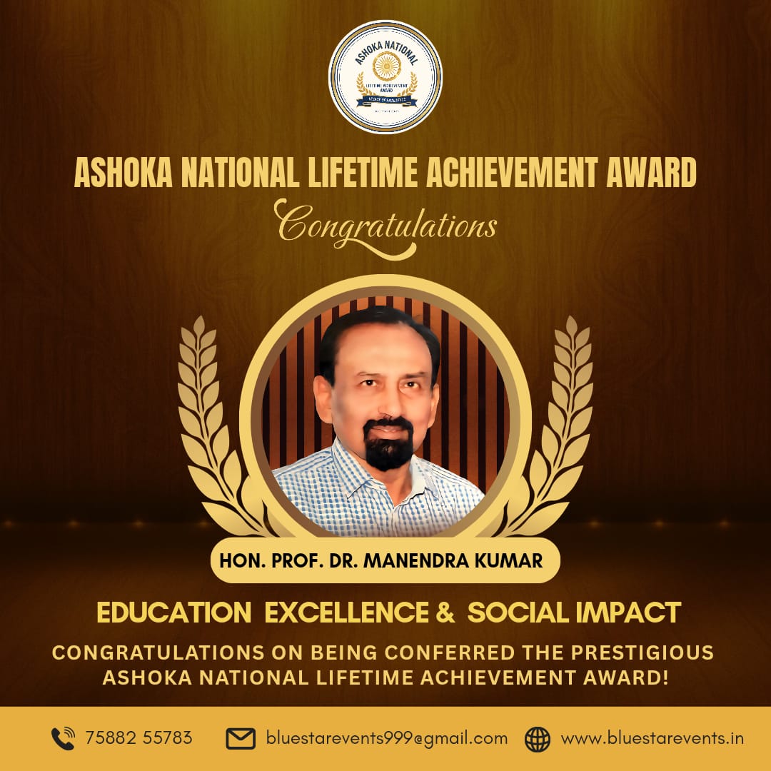 मुज़फ्फरपुर, बिहार | नवम्बर 2025: शिक्षा और विज्ञान जगत के लिए गौरव का क्षण — माननीय प्रो. (डॉ.) मनेंद्र कुमार, जो बिहार के मुज़फ्फरपुर से एक विख्यात शिक्षाविद् एवं पर्यावरण जीवविज्ञानी हैं, को ब्लू स्टार इवेंट, नासिक द्वारा आयोजित भव्य समारोह में “अशोका नेशनल लाइफटाइम अचीवमेंट अवॉर्ड 2025” से सम्मानित किया गया।