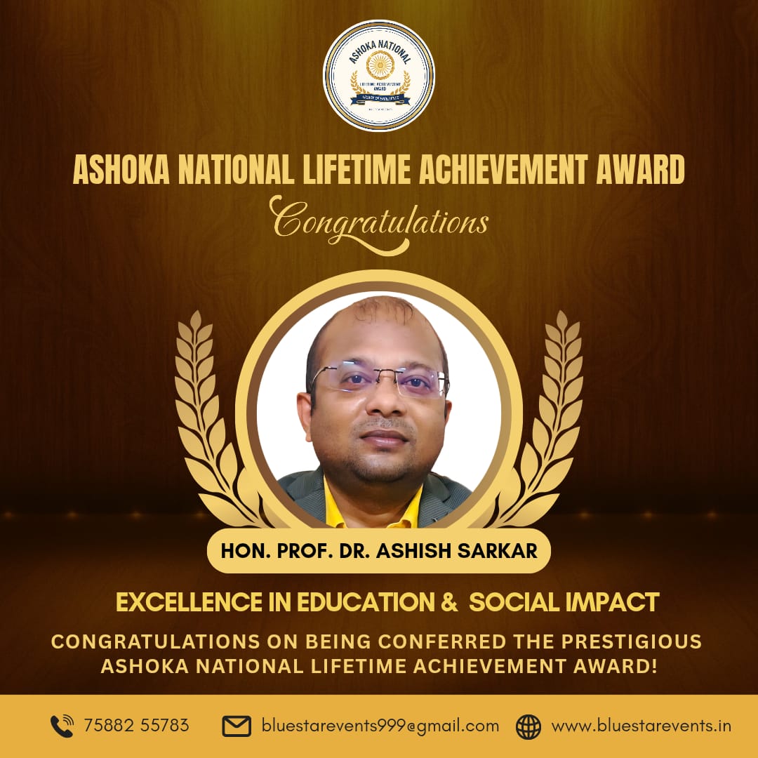 रांची, झारखंड – 13 Nov. 2025: शिक्षा, शोध और समाज सेवा के क्षेत्र में लंबे समय से उत्कृष्ट योगदान देने वाले माननीय प्रो. डॉ. अशिष सरकार को प्रतिष्ठित “अशोका नेशनल लाइफटाइम अचीवमेंट अवॉर्ड 2025” से सम्मानित किया गया है। यह राष्ट्रीय सम्मान ब्लू स्टार इवेंट द्वारा प्रदान किया गया, जो उन व्यक्तित्वों को सम्मानित करता है जिन्होंने अपने कार्य, समर्पण और प्रतिबद्धता से समाज में प्रेरणादायी बदलाव लाए हैं।